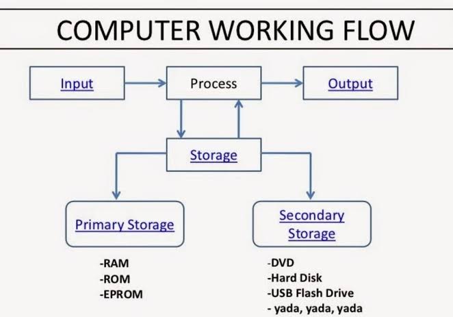 - Tahap Keluar (Output), data yang telah diproses oleh CPU dapat dicetak apabila sudah siap. Pencetakan ini bisa berupa hardcopy dan juga softcopy. Hardcopy berarti menggunakan media fisik seperti kertas ataupun yang lainnya. Softcopy berarti menampilkan gambar visual melalui monitor ataupun projektor. Peralatan output yang dimaksud disini adalah monitor, proyektor, printer dll.